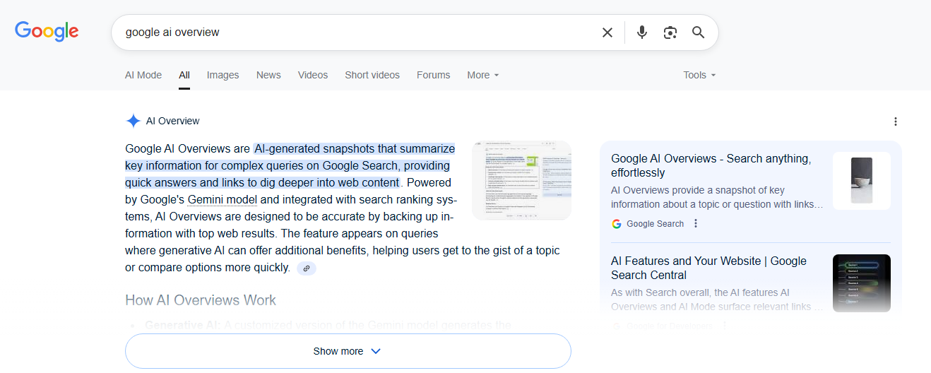 In the past, finding an answer to a specific question might have meant numerous Google searches. AI can now pull information together instantly and present it in a single, easy-to-read response. This is great for users, but it also means businesses may see that clickthrough rate is reduced, even if their content is being shown in search results.